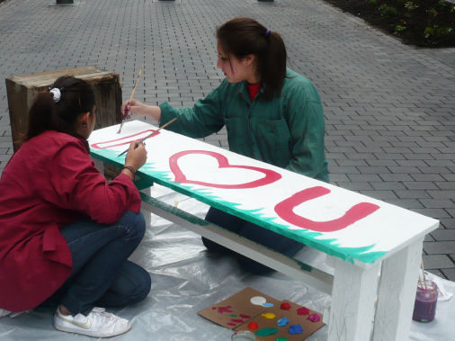 In Zweierteams entwarfen die Jugendlichen individuelle Gestaltungskonzepte für ihre Bank. Erste Skizzen wurden direkt auf das Holz übertragen, anschließend farbenfroh ausgemalt und lasiert. So entstanden zehn einzigartige Kunstwerke, die für kurze Zeit auf dem Hansaplatz ausgestellt wurden – Kunst im Freien, mitten im Leben.